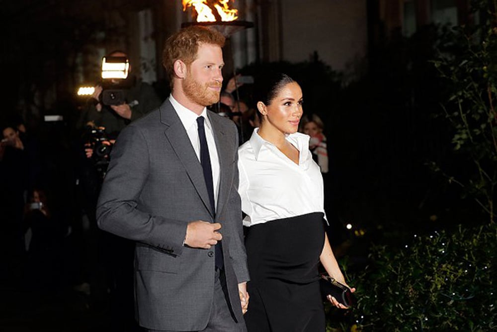Meghan, who recently announced she is pregnant with the couple's second child, wore an empire-style black dress with embroidery. Harry wore a light gray suit and white dress shirt, minus a tie.