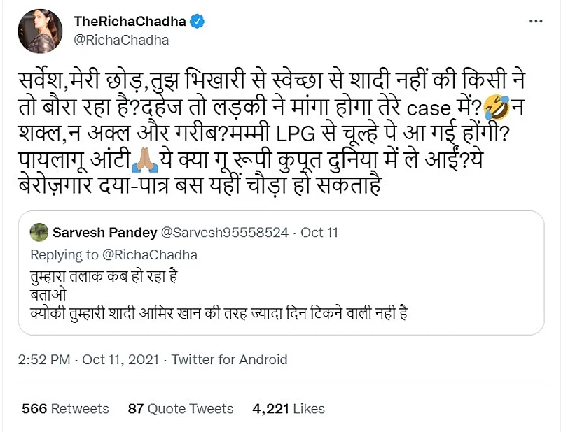The move comes after Richa, who is dating actor Ali Fazal, gave lashed back at a social media user on the platform who asked her when she was getting divorced. A user had written to Richa in Hindi: "When are you getting divorced? Tell us. Because your marriage is not going to last long, just like Aamir Khan's."
