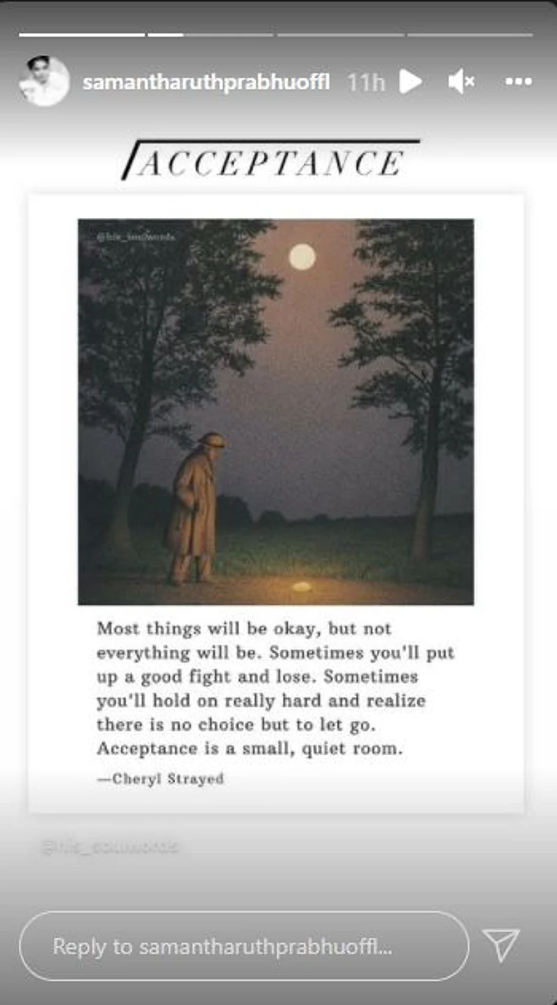 Actor Samantha Akkineni has been sharing inspirational words on her social media accounts following her separation from Naga Chaitanya. The South superstar is gradually and methodically attempting to move on in real life. She has become quite active on social media and continues to share cryptic remarks about moving on and reinventing herself. Her most recent post was on accepting oneself. She shared the quote by American author Cheryl Strayed on her Instagram stories that read, “Most things will be okay eventually, but not everything will be. Sometimes you’ll put up a good fight and lose. Sometimes you’ll hold on really hard and realize there is no choice but to let go. Acceptance is a small, quiet room."