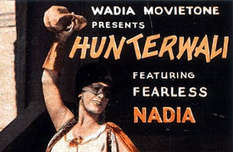 The Wadias teamed up with Mary. By this time, she had started using a stage name - Nadia. J.B.H picked it up, and whipped up the sensational title “Fearless Nadia”. In the first few films, she played walk-on roles with a few lines of dialogue, which gave her an opportunity to brush up her Hindi and Urdu. Come 1935, and Wadia Movietone launched Fearless Nadia with a bang, in a film called Hunterwali, “hunter” being an allusion to the whip she carried. The mask and general demeanour was modeled after Douglas Fairbank’s Zorro, but all in all Hunterwali was a fresh new masked vigilante. The film gave her abilities a free rein, allowing her to pull off stunts like jumping atop a moving carriage, and fighting goons while astride her horse. She did all her own stunts and did them with great flourish. The concept of stunt doubles didn’t exist, and the there were no green screens or CGI to spice things up. She jumped, hopped, rode, cycled, and even had a fierce battle cry of her own. For the next decade or so, Nadia appeared in film after film, playing various versions of the masked vigilante or warrior princess, showcasing breathtaking daredevilry on screen. In 1943, there was a sequel to the original Hunterwali called Hunterwali ki Beti, in which Nadia played the daughter as well.