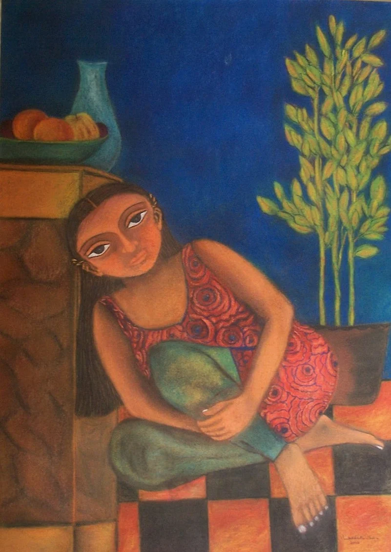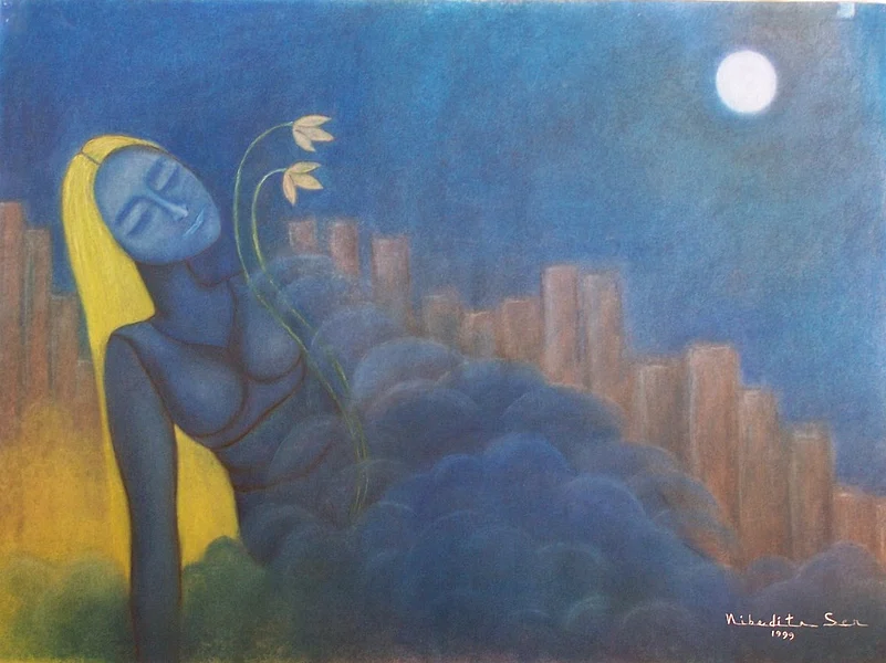 Radhika is a Gopini, married to a Gopi and is in love with Krishna, who had many wives. She is free from social inhibitions, because she doesn’t feel the need to ‘comply’. She only needs to follow her own quest, her inner search for excellence, epitomised by Krishna--the blue of water and space, the colour of the unfathomable sky and oceans…. My paintings of women as Radhika are done mostly in blue. And that is how they become quite inseparable in spirit.