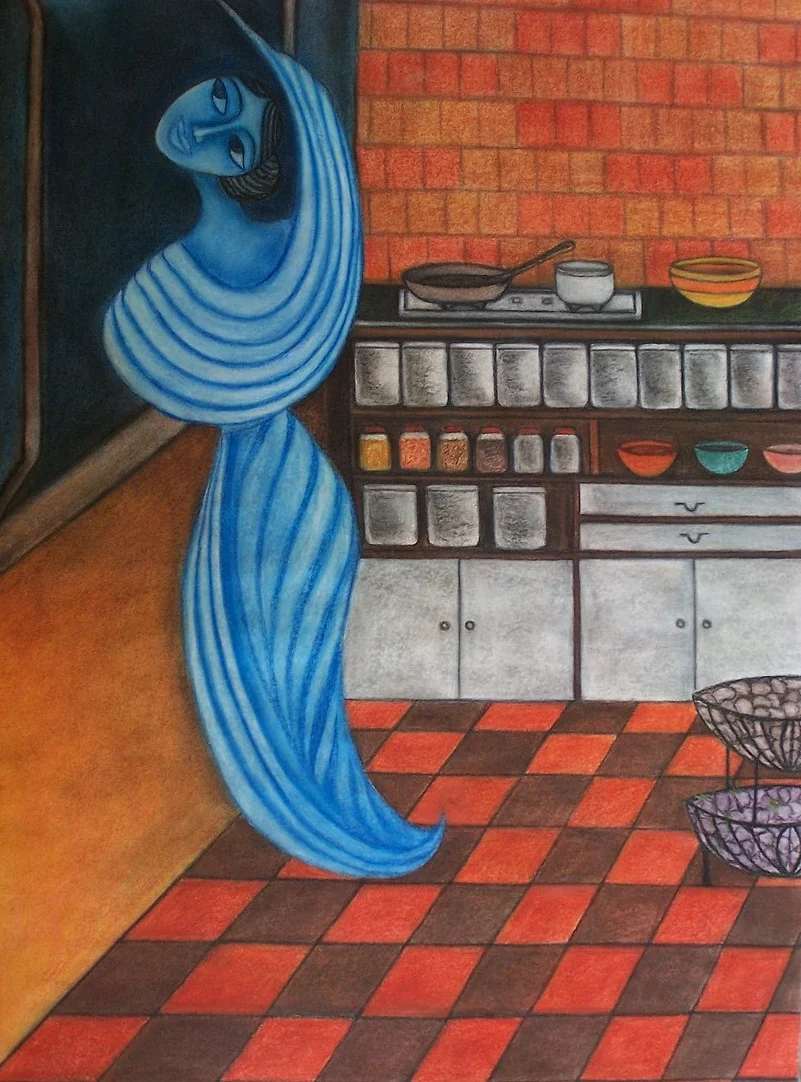 Krishna symbolises the blue of the sky. Women create their own, customised ‘private skies’, which function as their escape route from the mundane. Imbibing the sky, she sails over the clouds, above and beyond the concrete.