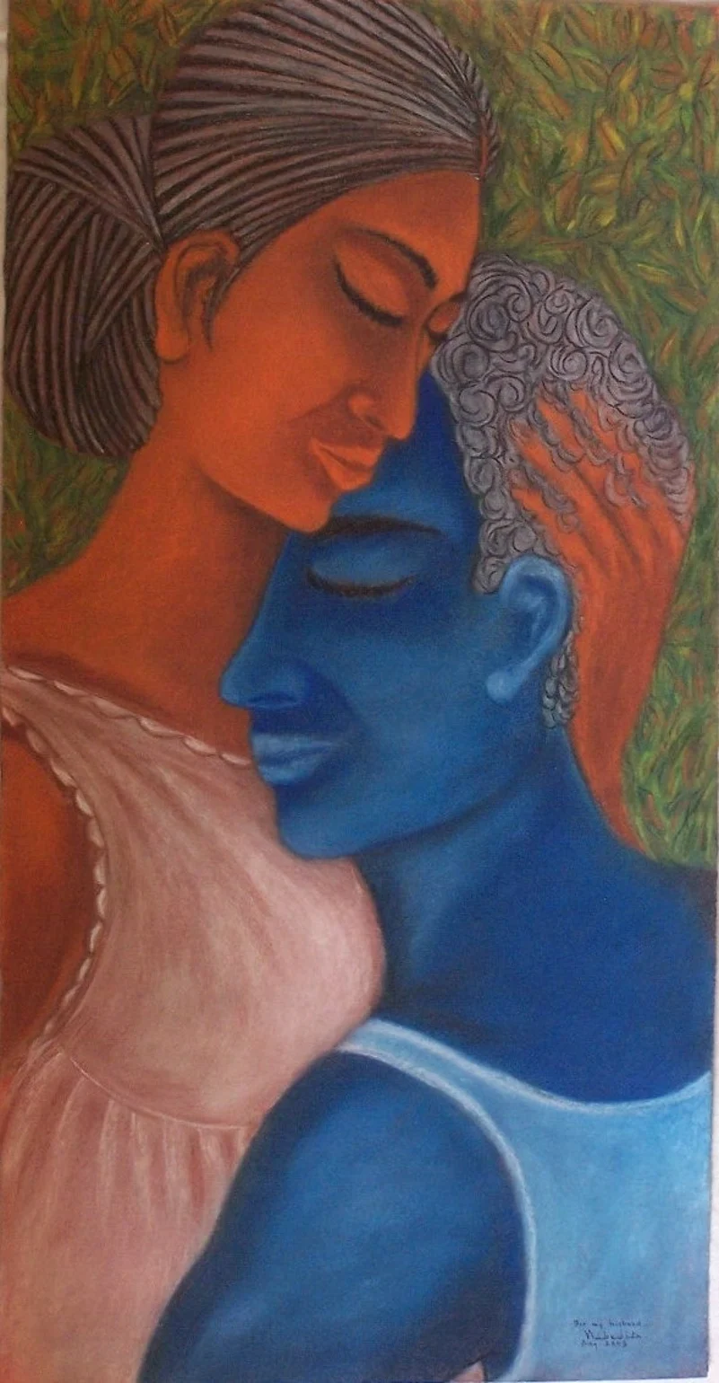 Done from the recollections of my student, who is physically blind. She is also a musician, always humming tunes of Indian ragas, engrossed in the harmony within herself and her passion for music. She is a Radhika in pursuit of perfect musical notes. And Krishna, the flautist, is the epitome of a perfect cosmic balance. Harmony and Krishna are one and the same.