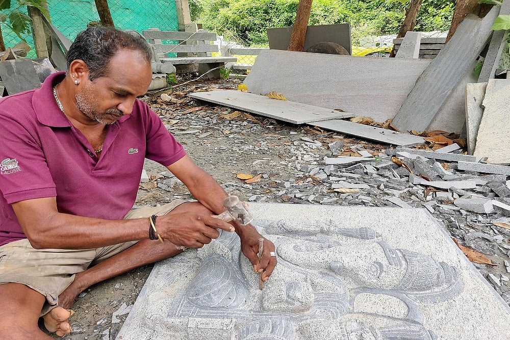 Walk through their work space, scattered with all sizes of stone, mostly untreated, and your eye will detect an elephant here, a panel of human figures there, plus some versions of Ganesha, whose body inspires a multitudes of poses and forms.