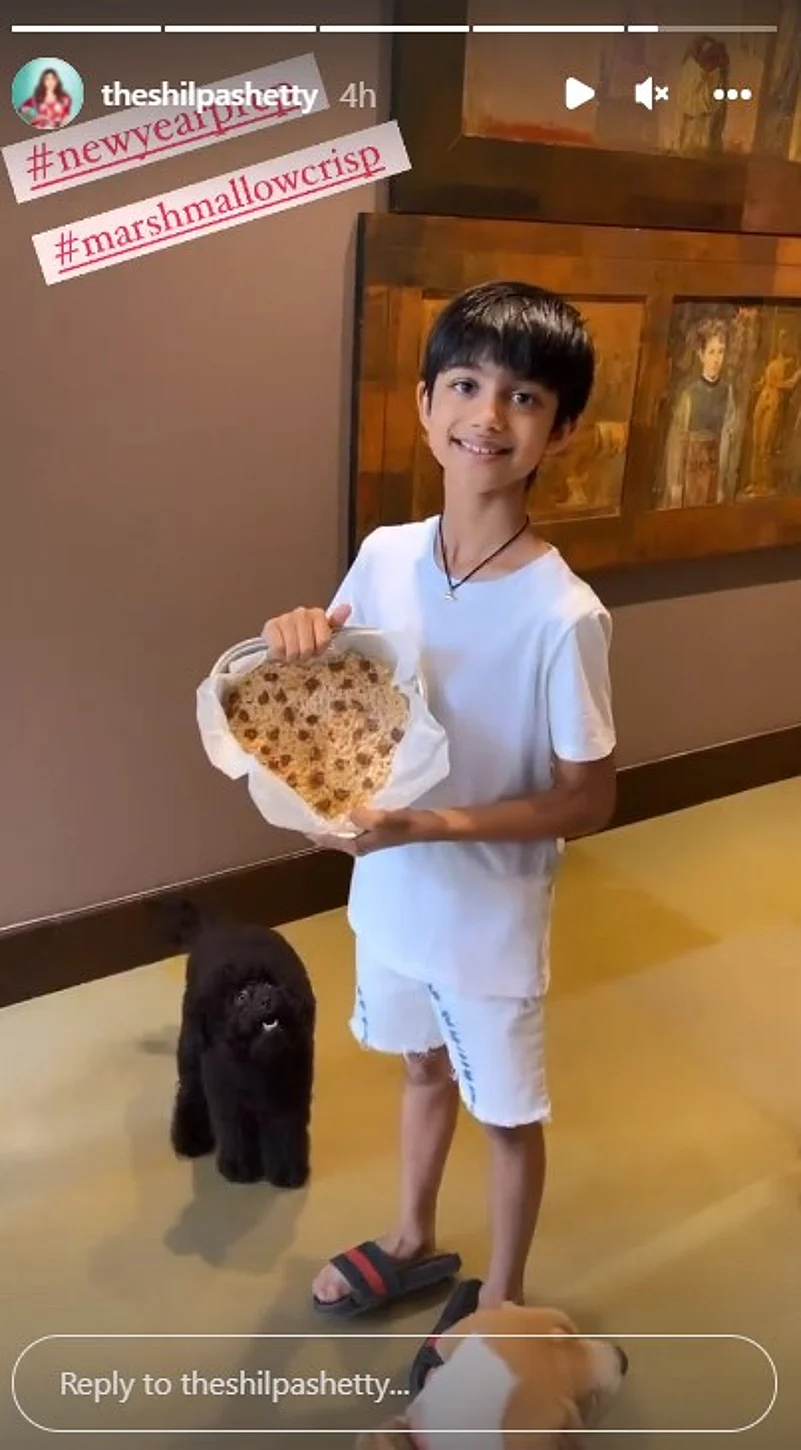 Shetty's son, Viaan can be seen holding a bowl of deliciously made marshmellow crisps to kick start the new year eve and binge on the delicious delicacy.