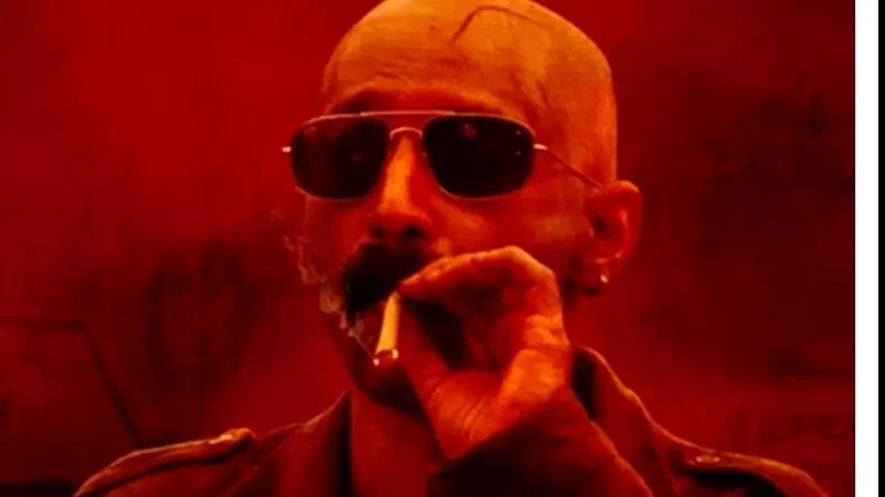 The poster features the actor in a bald look smoking a cigarette with swag as he dons a leather jacket rounded up with a pair of sunglasses and ear piercing. The poster has a monotone colour fill of blood red shade.