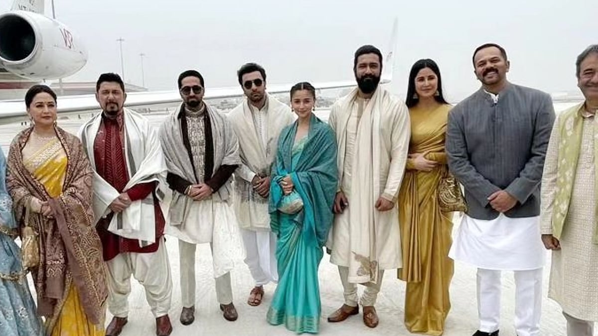 Several B-town celebs, who were invited for the auspicious consecration ceremony at the Ram Mandir in Ayodhya, reached the town on Monday morning. Madhuri Dixit with husband Shriram Nene, Katrina Kaif, Ranbir Kapoor, Alia Bhatt and Vicky Kaushal were seen posing together as they reached the temple city. They were received with a warm welcome and were offered red roses and red shawls at Ayodhya airport.
