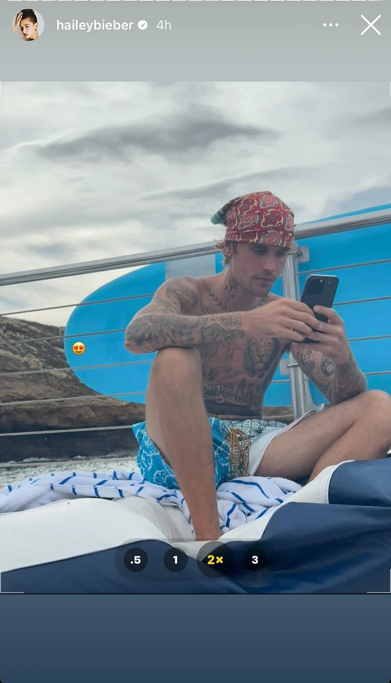 On Tuesday morning, the ‘Rhode’ founder took to her Instagram Stories, sharing a snapshot of the ‘Purpose’ crooner engrossed in his phone. Shirtless, he sported only a rust-coloured bandana and quirky blue shorts against a backdrop hinting at a seaside setting, suggesting a possible swim outing for the adorable couple. Alongside the image, she posted a heart-eyed emoji, affirming that he’s doing just fine.