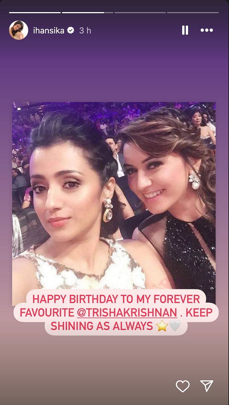Hansika, who was last seen in Tamil horror film 'Guardian', took to Instagram Stories and dropped a throwback picture with birthday girl Trisha. The photo, which seems to be from some event, shows the duo dressed in beautiful gowns.