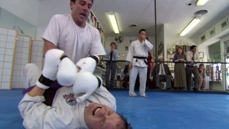 When Michael hears Dwight boasting about his "Karate Abilities" he asks him to punch him in the gut, turns out Michael was much hurt by it and calls out Dwight for a "real fight" at lunch time. The both go to a Karate Club and fight it out in front of all office employees. Much to everyone's surprise Dwight ends up losing the fight in his own Dojo.