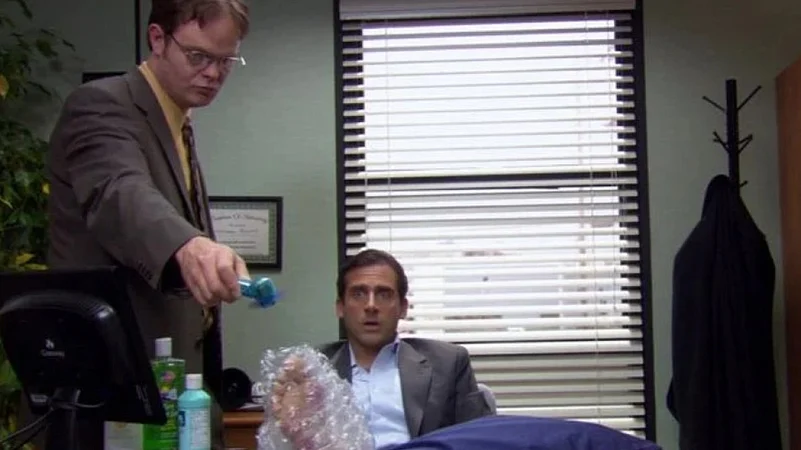 A regular day at the office of Dunder Mifflin ceases to exist, the episode opens with the boss Michael Scott (played by actor Steve Carrel) calling the office reception complaining of having had an medical emergency, that turns out to be his foot being burned of his Foreman grill. Hearing that his "superior" is in danger and no one is going for help, Dwight rushes to rescue his boss. Little does anyone expect that he would barely make it out of the parking, as he smashes his car into a pole of the way out. He does not stop and continues to go for help and the rest of the episode has a concussion from the accident.