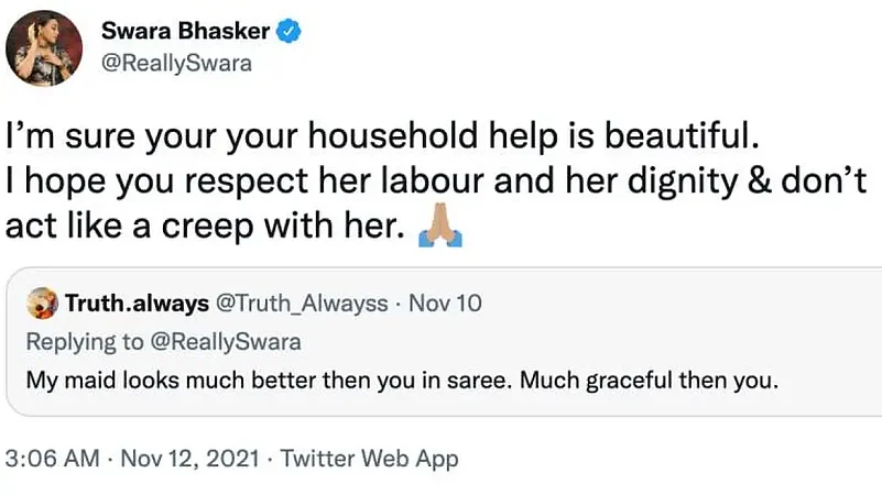 Swara Bhasker took to Twitter and dropped a selfie in which she can be seen sitting in a park, wearing a saree. Sharing the picture, the actress wrote, “A sari, a park, a walk, a book... ‘at peace’ must feel like this #smalljoys #gratitude #feelingwise.” However, one of the users targeted her and mentioned, “My maid looks much better than you in saree. Much more graceful than you.” After reading the comment, Bhasker decided to take a dig at him and said that the user’s household would be beautiful.
