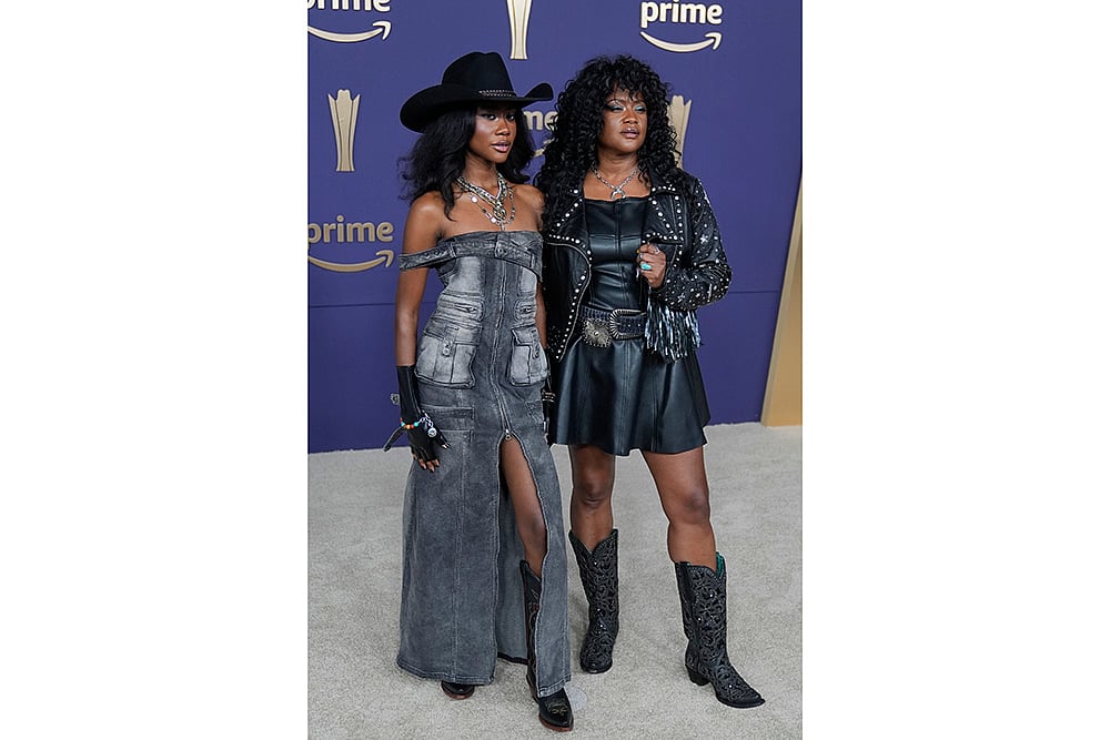 Prana Supreme, left, and Tekitha of O.N.E The Duo arrive at the 59th annual Academy of Country Music Awards at the Ford Center in Frisco, Texas.