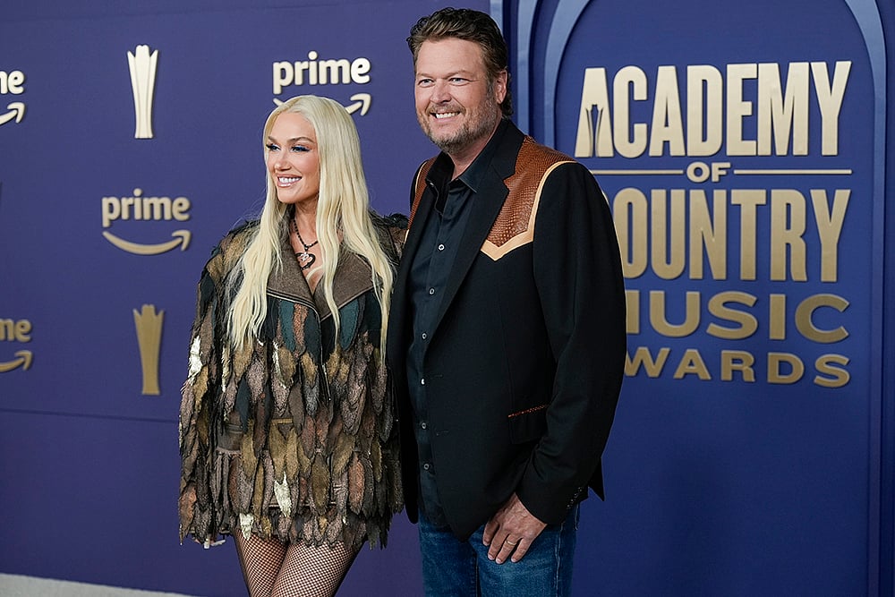 Gwen Stefani, left, and Blake Shelton arrive at the 59th annual Academy of Country Music Awards at the Ford Center in Frisco, Texas.