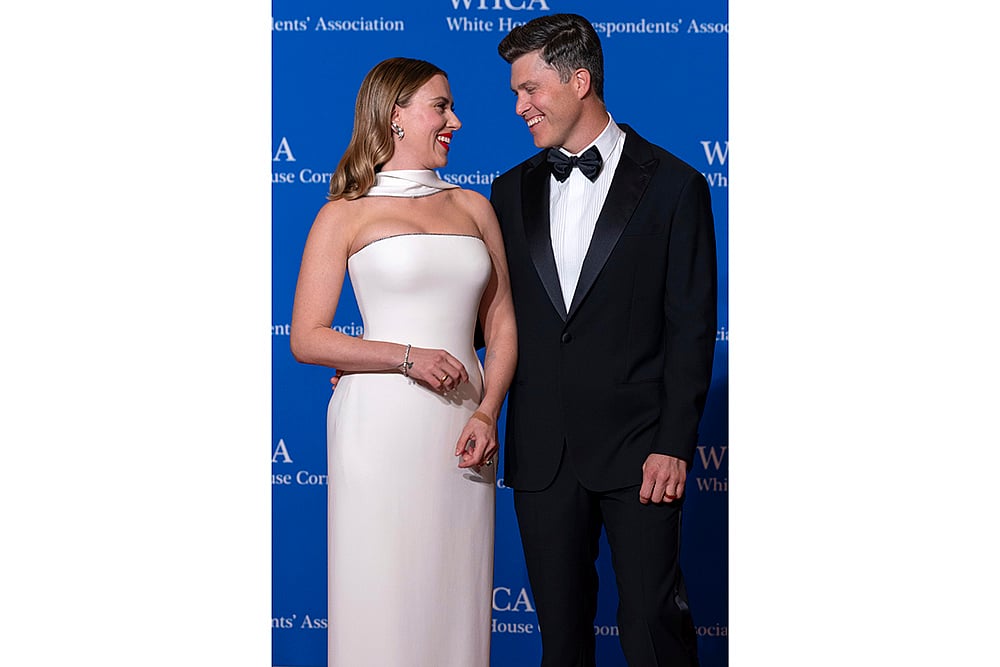 Actor Scarlett Johansson and comedian Colin Jost pose for photographers as they arrive at the annual White House Correspondents’ Association Dinner in Washington.