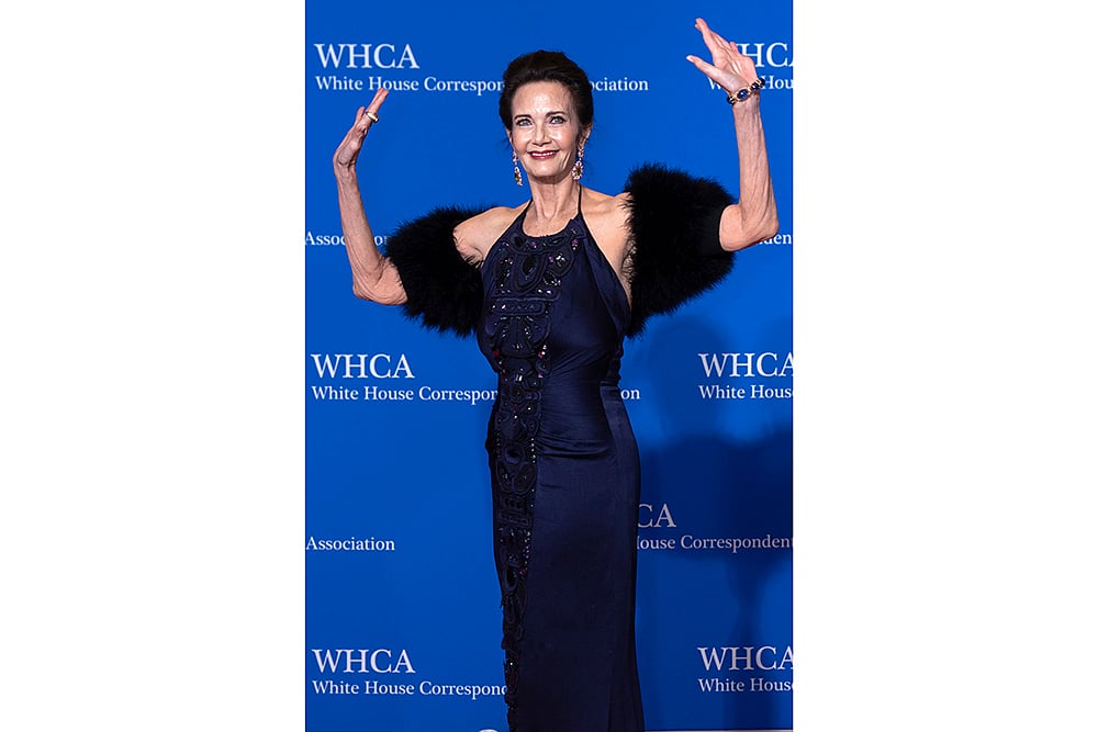 Actress Lynda Carter poses for photographers as she arrives at the annual White House Correspondents’ Association Dinner in Washington.
