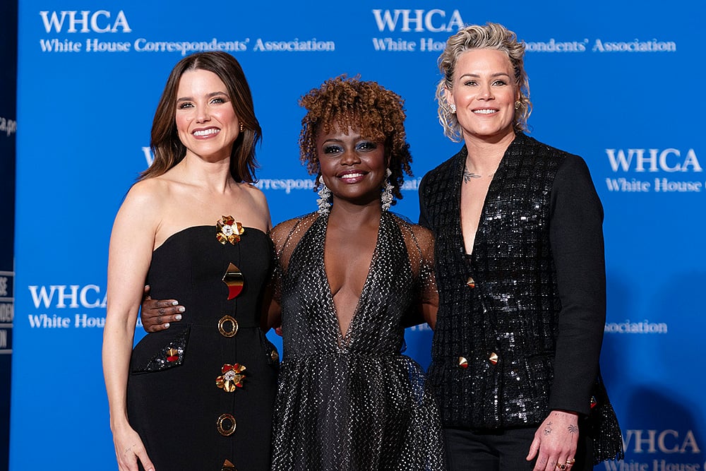 From left, actor Sophia Bush, White House Press Secretary Karine Jean-Pierre and former football player Ashlyn Harris pose for photographers as they arrive at the annual White House Correspondents’ Association Dinner in Washington.