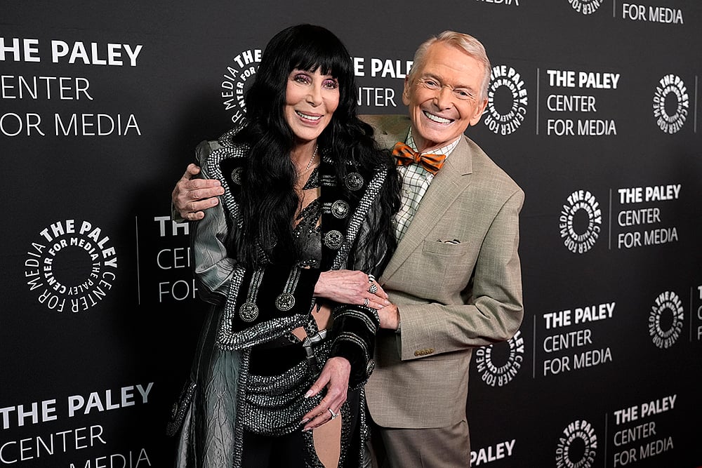 Fashion designer Bob Mackie, right, subject of the documentary film ‘Bob Mackie: Naked Illusion,’ poses with Cher at the premiere of the film at the Directors Guild of America in Los Angeles.