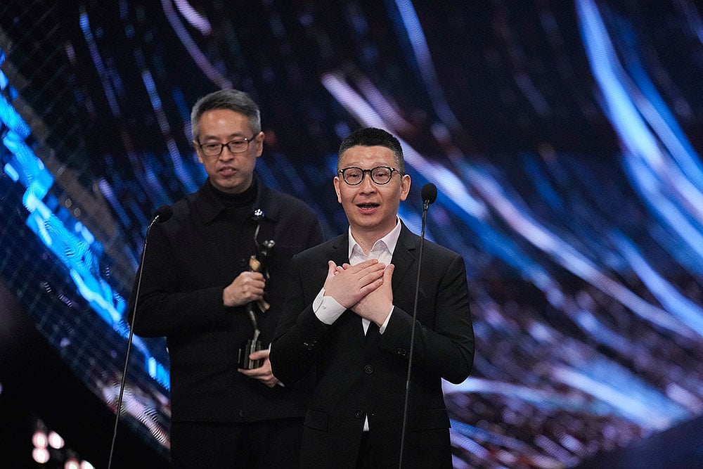 Hong Kong director Nick Cheuk reacts after winning the Best New Director Award for his movie ‘Time Still Turns The Pages’ at the 42nd Hong Kong Film Awards in Hong Kong.