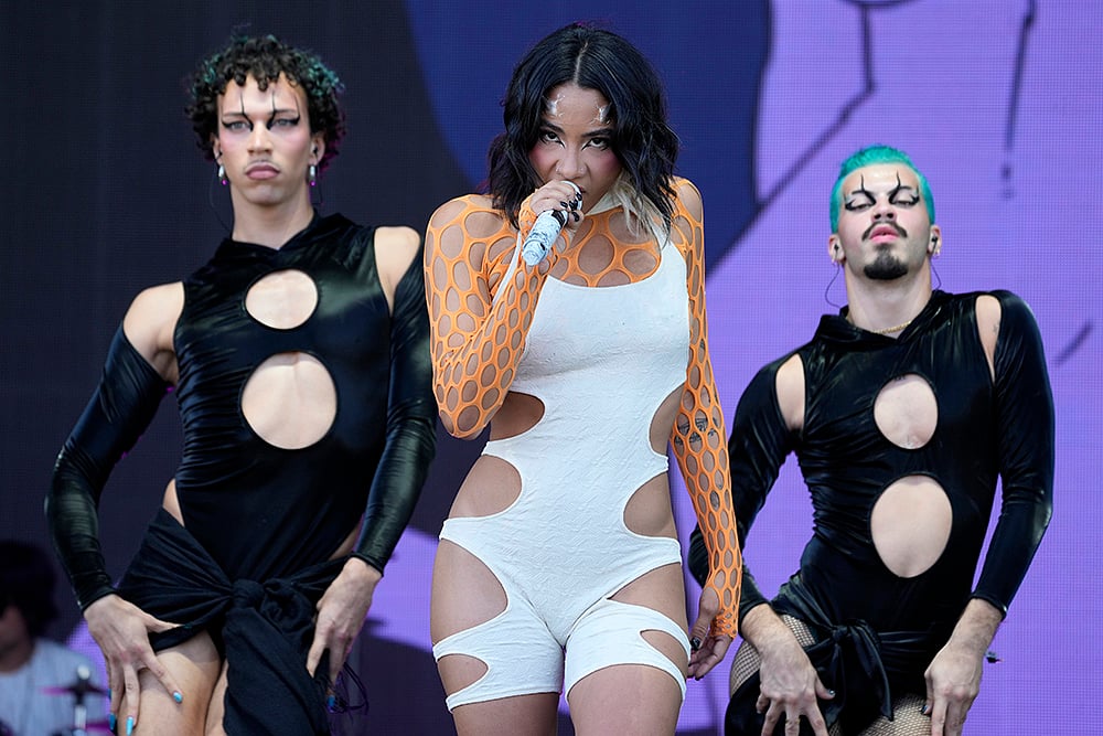 RaiNao, center, performs during the LA Pride in the Park festival at Los Angeles State Historic Park in Los Angeles.