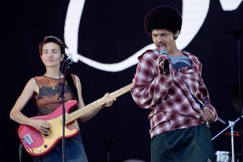 Isaac Dunbar, right, performs during the LA Pride in the Park festival at Los Angeles State Historic Park in Los Angeles.