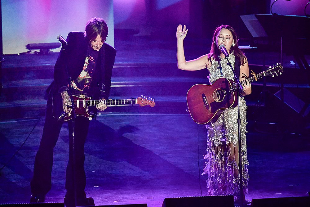Keith Urban, left, and Hillary Lindsey perform at the Songwriters Hall of Fame Induction and Awards Gala at the New York Marriott Marquis Hotel in New York.