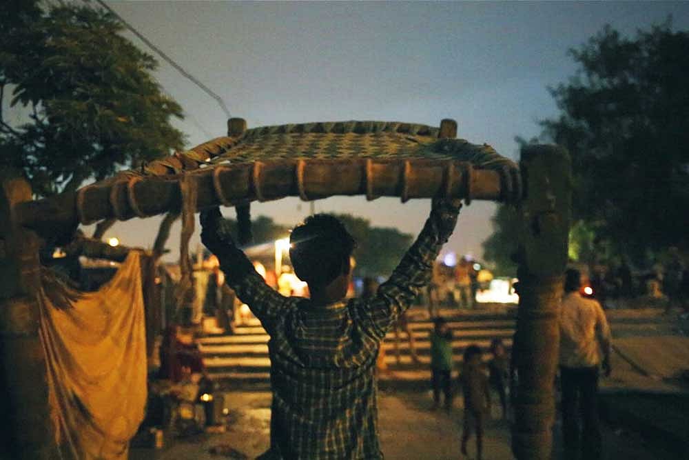 The film brings an intent humanistic gaze to Shakeel and his nightly wanderings. The viewer wonders how the camera and Shakeel bonded in the first place. Compared to other men in the film who are almost poetic in their alertness, their bodies yoked to labour, Shakeel brings an indifferent, perfunctory attitude to his ongoing task of begging for money and foraging for sleep. The camera follows Shakeel, often seen wearing a secondhand woman's coat, to an open-air sleepers' market. The market is run by the charismatic turflord , Jamaal Bhai. Although he first appears as a simple chaiwallah, we find out that Jamaal oversees the nightly dealings of charpais, or woven cots, in the sleeping colony, along with his strongmen who keep order, collect dues, and when needed, evict sleepers. In Jamaal's company and amid the lights and music of the market, Shakeel must deploy his limited powers of persuasion. He has no special talent, such as reciting poetry or playing instruments — the skills other men use to negotiate an affordable bed. Rather, most of Shakeel's sleep is gotten on credit through persistent nagging. This is not the quintessential "hand to mouth" existence. Rather, it is bare subsistence, and one that quickly mounts into debilitating debt.