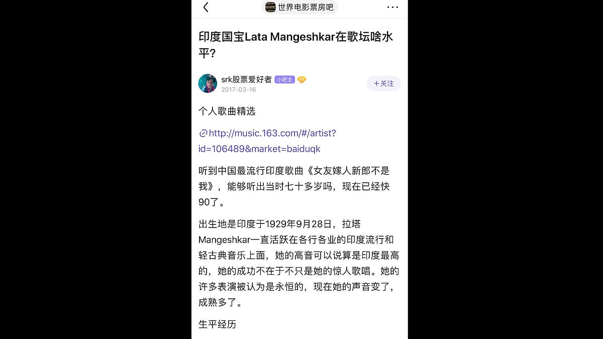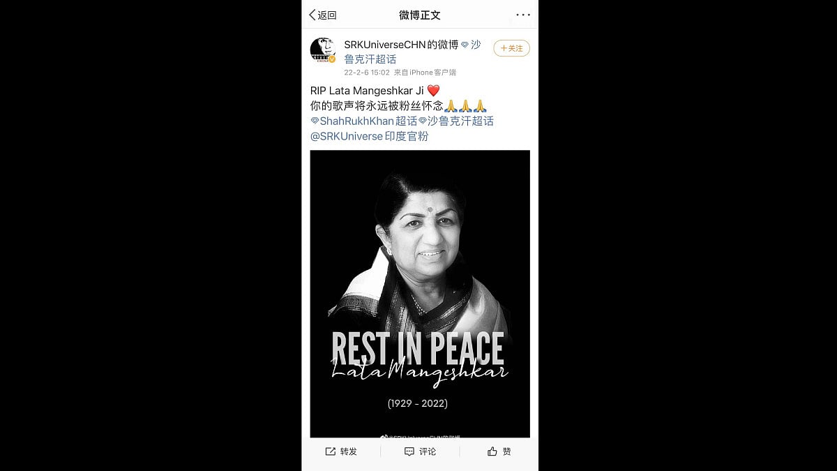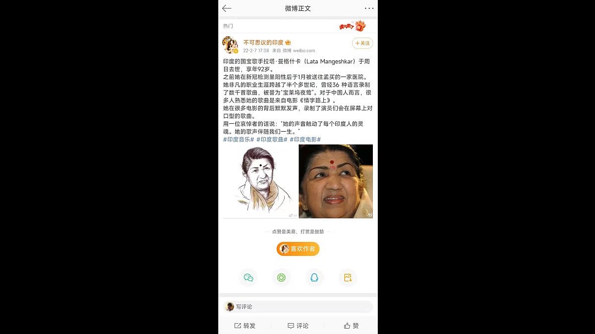 Not only legendary artist Han but Mangeshkar's magnificent melodies have mesmerized many Chinese people for decades. Even after her death on Sunday (February 6), many of her Chinese fans shared their emotion and sentiments associated with the Indian diva's songs on their biggest microblogging app/website Sina Weibo, moments section of the multiutility social media app WeChat and under the comments section of various video hosting/sharing platforms like iQIYI, Bilibili, Youku among others. One Weibo user, a self-proclaimed Shah Rukh Khan, with Mangeshkar's obituary photo posted: "Your beautiful voice will always be remembered." Another user, sharing a screenshot of the New York Times news report on the Indian icon's death, wrote: "We possibly don't know her exact name, but we are so familiar with her beautiful voice." Mangeshkar's songs, spanning over half a century since the 1950s, are ubiquitous among the Indian music content in the apps mentioned above and websites, apart from the biggest Chinese music app, QQ Music, a Tencent-Spotify joint venture. People even posted lyrics of the song under various videos of the Indian singing maestro's most memorable songs.