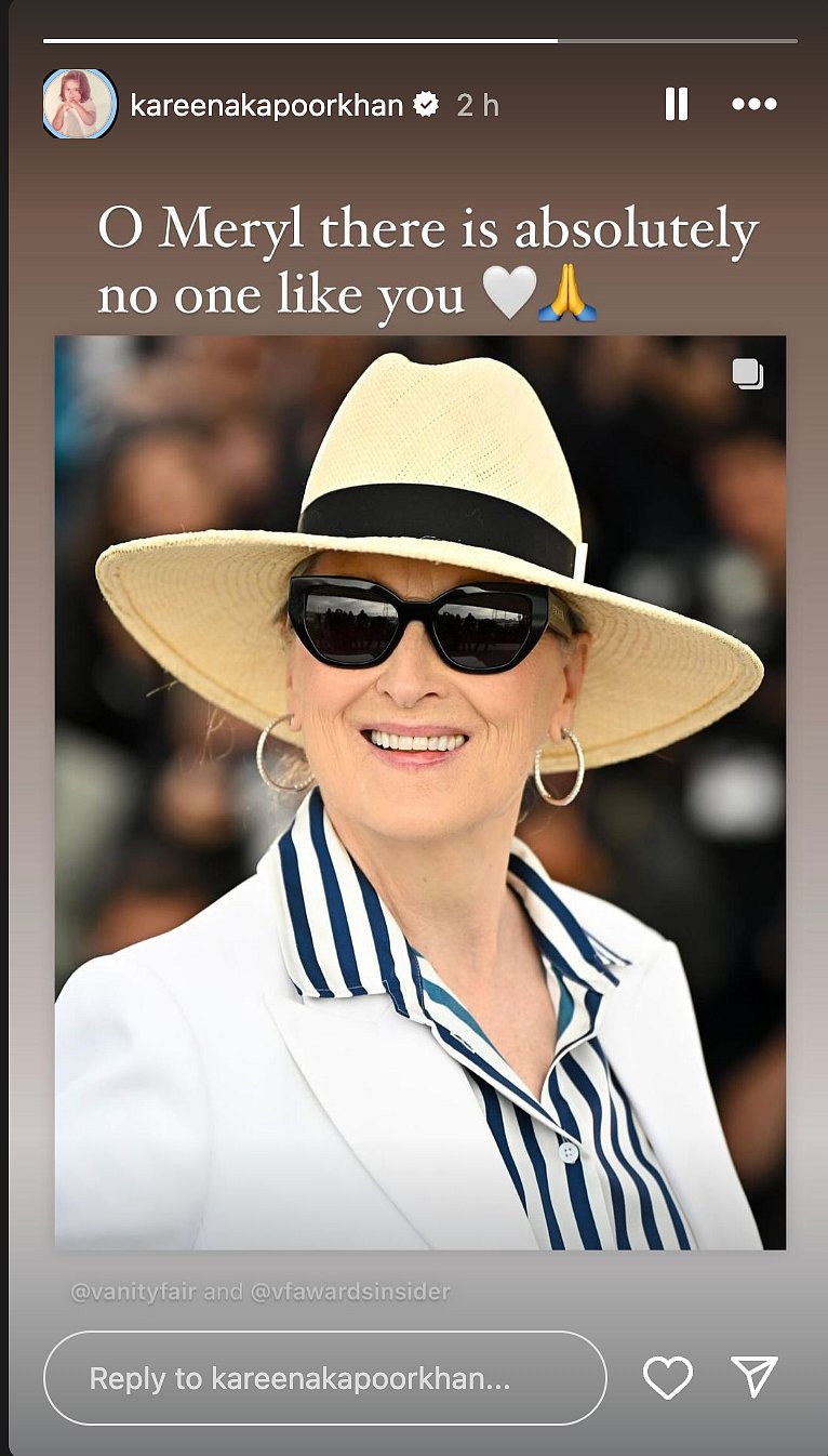 Kareena took to her Instagram story, where she shared a post about Streep at the 77th Cannes Film Festival. In the image, the icon is seen wearing a white pantsuit featuring high-waisted trousers and a blue-and-white striped shirt underneath her blazer.