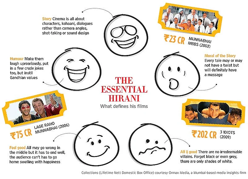 So what makes Hirani click? Is it that he understands the psyche of the Indian middle class well? That the issues he touches upon reach out to the man on the street: be it the need to humanise the medical profession in Munnabhai MBBS or the catchy Gandhigiri mantra in Lage Raho Munnabhai. No wonder then that all his films have been remade in the south and have been successful there too. The excellence-over-success mantra he propounded in 3 Idiots went beyond India in its appeal, connected in a weird and wonderful way with even audiences in China and Japan. “His subjects and treatment can simultaneously appeal to a variety of audiences and age groups. From six to sixty, as the blurbs used to say. And that’s every filmmaker’s dream,” says Sriram.