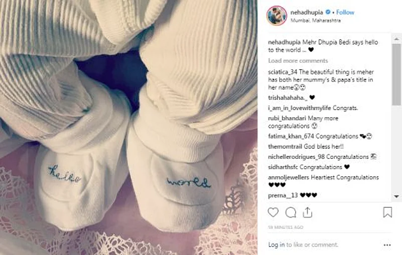 Neha Dhupia on Tuesday took to Instagram, where she shared a photograph of her baby's feet wearing booties. The booties read: "Hello world".