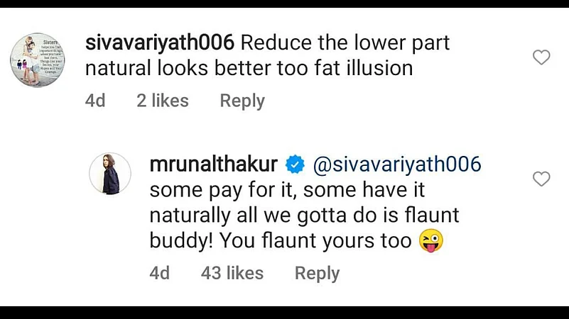 Mrunal Thakur shared a short video where she can be seen kickboxing. While posting the video, she wrote, “just a regular day with @rohityson_ and @thegirlwithabs”. A lot of appreciation comments flooded by her loved ones as soon as she posted the short video. However, a troll commented, “Back is likeMATKAA (pot)”. But, she did not stop and gave the user a sarcastic reply. She wrote, “Thank you Bhaiyaa ji”. Another user wrote, “Reduce the lower part natural looks better too fat illusion”. She gave the user a befitting reply and wrote, “some pay for it, some have it naturally all we gotta do is flaunt buddy! You flaunt yours too”.