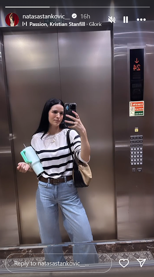 Taking to her Instagram Stories, Natasa Stankovic shared a mirror selfie from the elevator. The model was seen wearing baggy jeans with a black and white striped t-shirt. She chose a brown belt and a beige and brown bag with her outfit. She posted the picture to the song ‘Glorious Day’ in the background. She was also carrying a green water bottle to keep herself hydrated throughout the day.