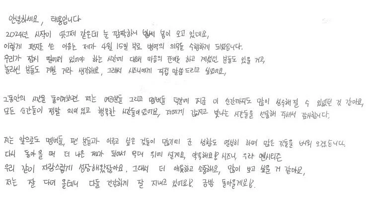 The handwritten letter started with, “Hello, this is Taeyong. It seems like the beginning of 2024 was yesterday, but spring is already coming in the blink of an eye. The reason why I wrote this letter is that I will be serving in the military as of April 15th. Some of us were preparing for the time we had to be apart for a while, and I think there were some people who were surprised, so I wanted to tell NCTzens directly. Looking back on the past time, I think I was able to grow more mature even until this moment thanks to you and the members. All the moments were really meaningful and happy times. Thank you for giving me a lot of shining times as a present.”