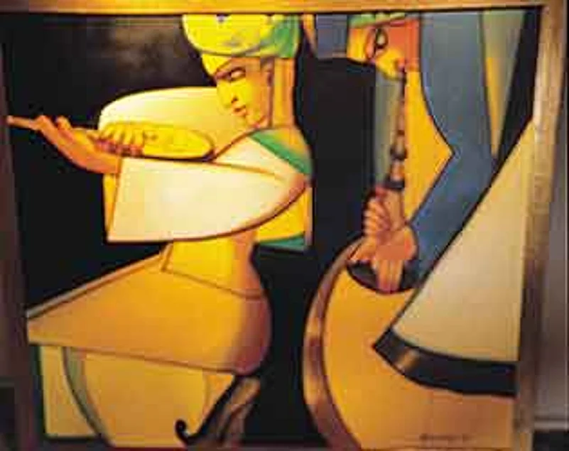 And there's the tightrope walking. Katayun Saklat, who owns Gallery Katayun in Calcutta describes Maity's way of approaching a large painting of the Vivekananda Setu (a bridge across the Hoogly river) that had been commissioned by ITC: "It was a tight deadline. He woke up early in the morning and started work. Midway he left. I asked him, 'Where are you going—you haven't finished!' He said, 'I know what size this will be. I am going to the framers so the frame will be ready in time.' He came back and completed his painting of the bridge by night, which was far more difficult than painting it by day."