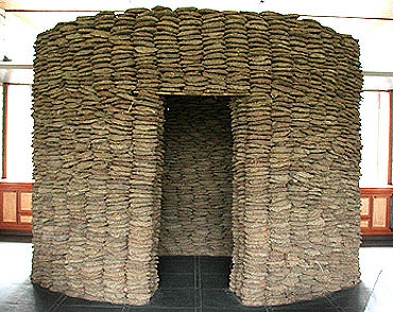 Since then, his confident handling of his medium, like his international stature, has only grown. Gupta uses symbols of pre-modern or low-tech India—neem twigs, cowdung pats, cycles and scooters cast in bronze—as well as huge, shiny stainless steel buckets and kitchen racks, which speak of evolving aspirations in an India on the brink of its encounter with globalisation. At the Palazzo Grassi at Venice in 2007, Gupta's Very Hungry God—an enormous grinning skull, made entirely of kitchen utensils—was suspended above a canal, creating a maelstrom of interest. It was bought by French billionaire Francois Pinault, one of the owners of Christie's. Recently, Gupta also created an entire conveyor belt of luggage—bundles, boxes tied with string, and trolleys, all cast in bronze and, like the real thing, trundling through space. It sold to a German collector for Rs 4.5 crore.