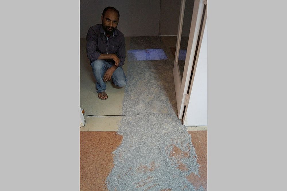 Santiniketan-groomed Telugu Ravi Kumar Porika’s video work has a short gravel-laden path lit up midway with a projector-generated moving image of a person’s feet in walking action. “You notice the man also walking on bare legs, right,” he asks. “Overall, it’s the unending journey of us all—where we change our footwear constantly, but the trip seldom ends early.”