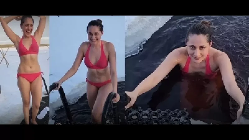 In a video on her social media, Pragya Jaiswal documented her plunge into an ice bath in Finland which showed the actress going from a sauna directly into an icy opening in a lake in the middle of Finland's snow.