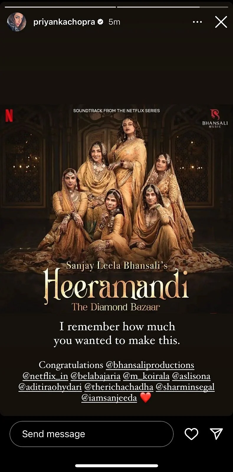 Sanjay Leela Bhansali’s globally acclaimed show ‘Heeramandi: The Diamond Bazaar’ has been receiving countless love from the fans and the audiences and cemented its position as the biggest-ever show. Now after receiving positive reviews from the film fraternity, Priyanka Chopra too has now cheered for the web series, and praised the show’s entire cast.