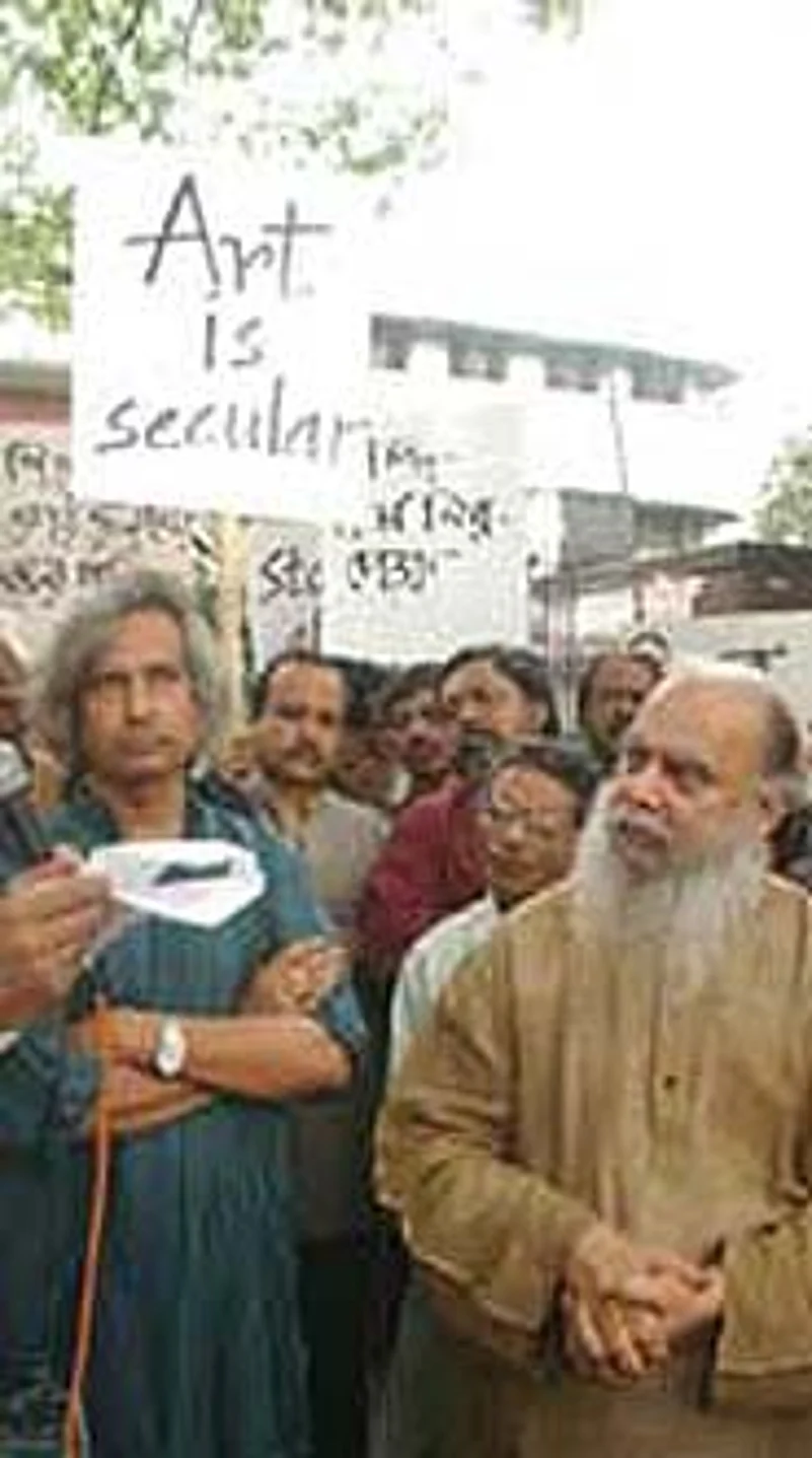 Here, let's have a quick look at a word that'scome up anew in the last week, with a resonance it doesn't usually have inthis country. In a photograph of the protest at the Academy ofFine Arts, published in The Telegraph, a sign hovering over the heads of Jogen Choudhury and Shuvaprasannadeclares, "Art is Secular". This word, 'secular', given to usby our Constitution, was famously reinscribed in our national life as a noun, 'secularism', with a very particular meaning: respect for a plurality ofcultures and faiths. In this way, the 'secular' becomes an embodiment ofnationalism, and intellectuals in India conduct a discussion that's primarilynationalist, based on a constitutional understanding of the word, when speakingof it. Yet the sign saying "Art is Secular" is not so much defending afeature of the Indian nation-state as it is an aspect of Indian modernity; thisdistinction needs to be made; the fact that it isn't leads, in part, to theabrasions we've been witnessing recently. The interior, creative life of the 'secular', which is one of the most crucial constituents of our modernity,of, in effect, ourselves, has never been fully acknowledged in India; and it hasno constitutional defence, unless you place 'art' under the inadequaterubric of 'freedom of expression'. After all, 'culture' is neither afaith, nor a linguistic state, nor a recognized world-view. How do we defend 'art' as Indians unless we admit to ourselves that there are other laws andvalues that govern our lives as 'secular' human beings besides theconstitutional ?
