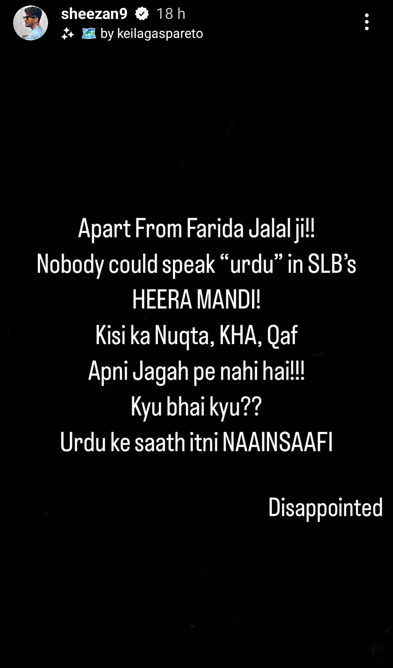 Expressing his disappointment over 'Heeramandi', Sheezan wrote on Instagram story, "Apart from Farida Jalal ji! Nobody could speak 'urdu' in SLB’s Heeramandi! Kisi Ka Nuqta, kha, qaf apni jagah pe nahi hai!! Kyu bhai kyu?? Urdu ke saath itni naainsaafi. Disappointed''.