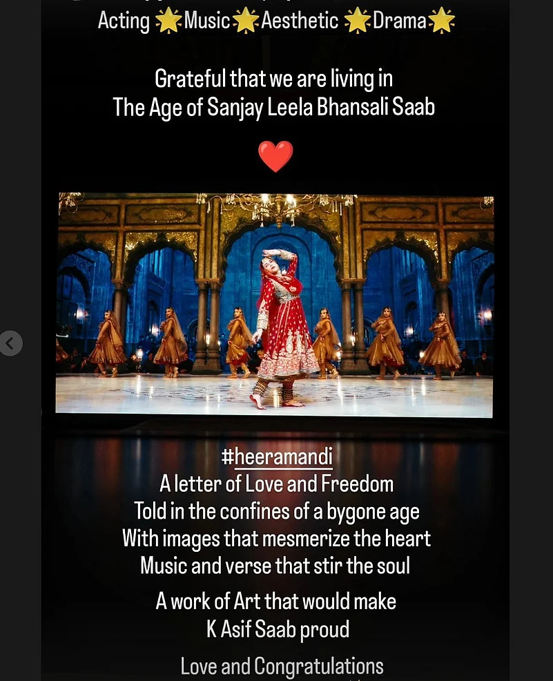 Now adding to it, Aditi’s fiancé and Telugu actor Siddharth, has also showered his admiration on the show. Taking to his Instagram story, the actor shared a poster of ‘Heeramandi’, and lauded its ‘acting, music, aesthetic, and drama’. In the note that he wrote, he mentioned, “Grateful that we are living in the age of Sanjay Leela Bhansali Saab. A letter of love and freedom told in the confines of a bygone age with images that mesmerise the heart, music, and verse that stir the soul—a work of art that would make K. Asif Saab proud. Love and congratulations to the whole team!” In the show, Aditi is seen in the role of Bibbojaan.