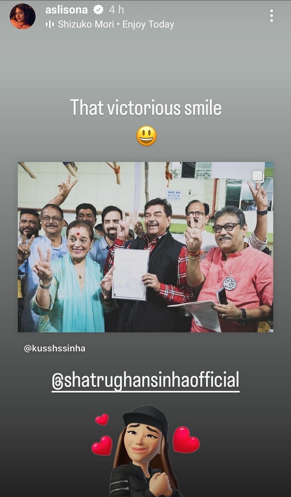 Sonakshi Sinha took to Instagram to congratulate her father on his victory. She also gave a shoutout to the people of Asansol as she shared a video on her Instagram Story.