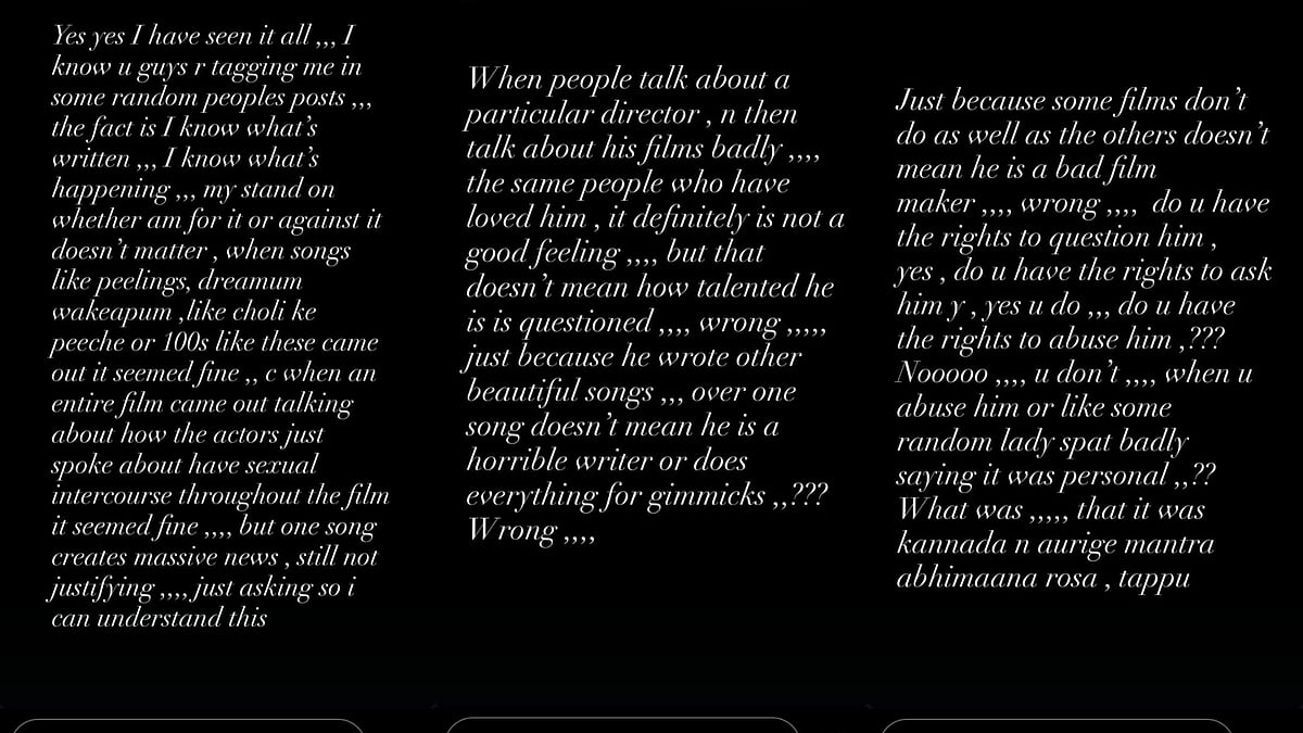 Taking to her Instagram Stories, Rakshita wrote, “I know what's happening. My stand on whether I am for it or against it doesn't matter, when songs like Peelings, Dreamum Wakeupum, like Choli ke Peeche or 100s like these came out it seemed fine (sic),” adding, “When an entire film came out talking about how the actors just spoke about have sexual intercourse throughout the film it seemed fine. but one song creates massive news. still not justifying, just asking so I can understand this (sic).”