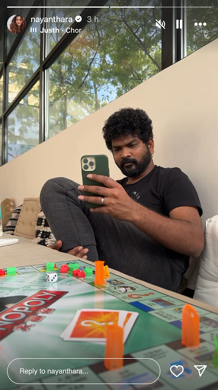Shivan then shared a clip showcasing the Monopoly game and later panned the camera to Nayanthara, who was seen talking to him while he filmed her.