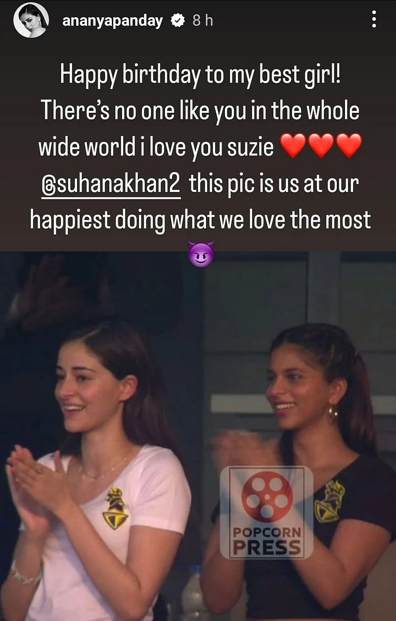 Ananya wished 'happy birthday' to her 'best girl' and added, "There's no one like you in the whole wide world. I love you Suzie. @suhanakhan2 this pic is at our happiest doing what we love the most (sic)." She also shared a pic of both enjoying one of the IPL matches.