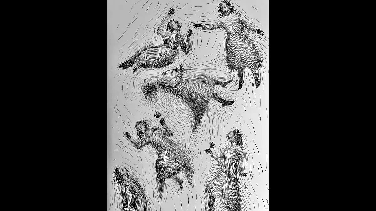 The artworks by Anantnag-based Khytul Abyad are an exploration of identity, freedom, dissent, and feminism, against the dystopia of Kashmir. Evident in the titles of her black-and-white sketches — Lonely: One Word, Clear Blue Nothingness, Hypersomniac, Dance of the Dead, Children at War, Hiraeth, etc. — that are mostly human portraits in hatching technique.