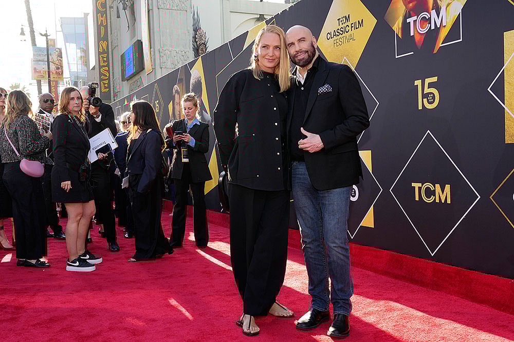 Uma Thurman, a cast member in ‘Pulp Fiction’, poses at a 30th anniversary screening of the film on the opening night of the TCM Classic Film Festival at the TCL Chinese Theatre in Los Angeles.