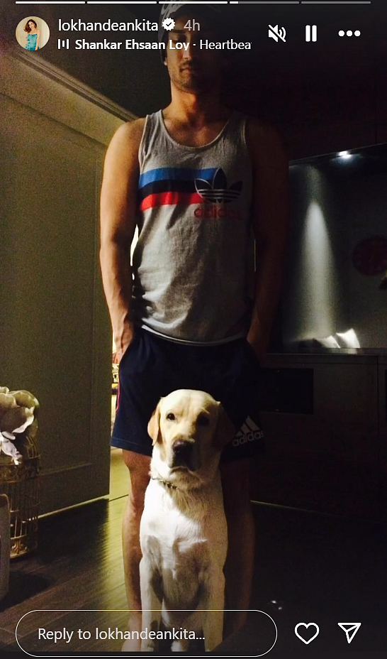 Taking to her Instagram Stories, Ankita Lokhande shared a picture of Sushant Singh Rajput with his labrador, Scotch. The actor was seen dressed in a grey printed vest, black shorts, and a beanie. Fudge was seated before the actor. She did not add any caption to the picture, but she added the tune of the ‘Heartbeat’ from ‘Kal Ho Naa Ho’ that has been composed by Shankar-Ehsaan-Loy.