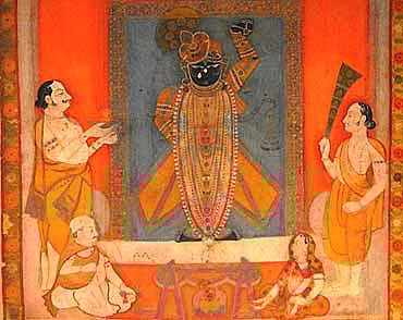 "Unlike other forms of Indian painting, pichhwais are life-size," says Praful. "Krishna, his leela, the other figures—all are depicted life-size, so that for a single moment, the viewer gets a feeling of the grace and grandeur of his world and is transported into it."